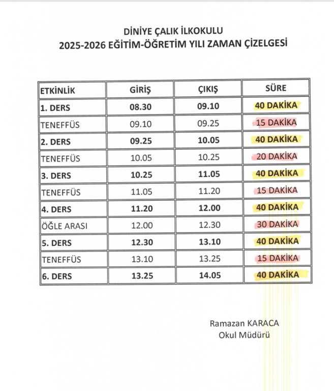 2025-2026 EĞİTİM-ÖĞRETİM YILI DERS GİRİŞ-ÇIKIŞ SAATLERİ